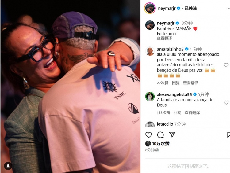 内马尔更新社媒晒拥抱自己母亲的照片:生日快乐妈妈,我爱你