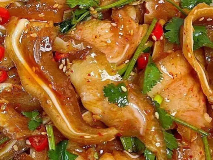 3、猪耳朵煮熟后,捞起来沥干水分,切成片放入碗中,再倒入凉拌酱汁,撒上香菜碎,搅拌均匀即可端上桌开吃。