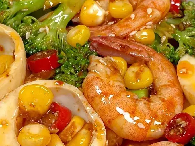 5、将西兰花、鸡蛋白、虾仁和玉米粒都放入碗中,倒入凉拌酱汁,搅拌均匀即可端上桌开吃。