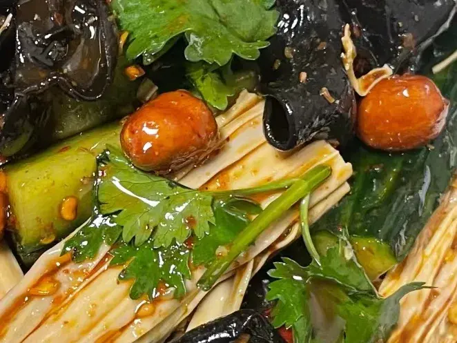 准备食材:黑木耳,黄瓜,腐竹,炸花生,香菜,凉拌酱汁。