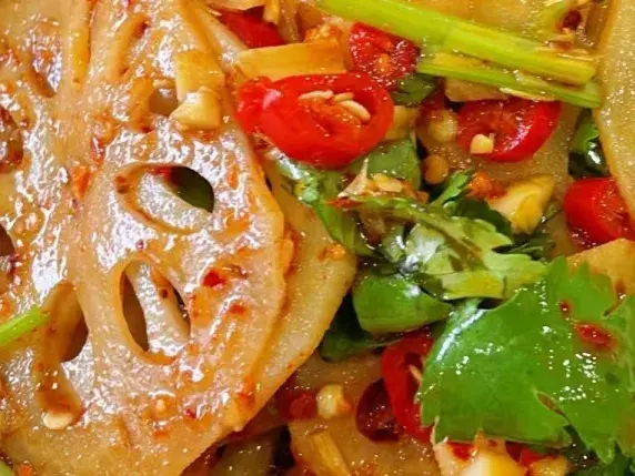 3、将凉拌酱汁倒入莲藕片中,撒上香菜铺上,抓拌均匀腌制入味,即可端上桌开吃。