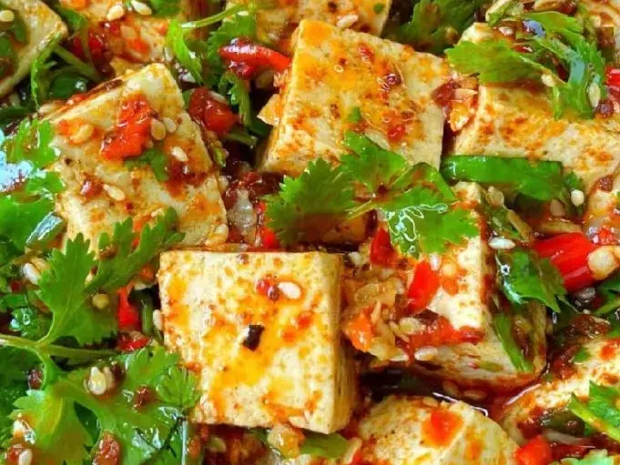 六、凉拌豆腐准备食材:嫩豆腐,小米辣,葱花,白芝麻,辣椒面,香菜。